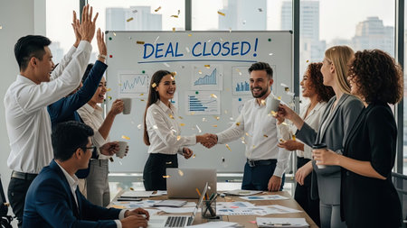 A diverse group of professionals celebrate a successful deal, marked by a handshake and celebratory gestures. The scene features a whiteboard, confetti, and individuals of various ethnicities. The image showcases natural lighting and could be suitable for business, finance, or success-related visual content. It is ideal for marketing or editorial usage.