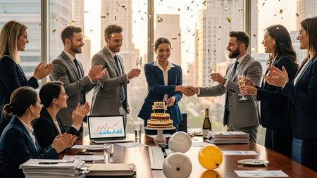 A diverse business team celebrates an achievement in a modern office. People are gathered around a table with a cake and champagne. The composition features natural lighting and a celebratory atmosphere. This image is suitable for various commercial uses, including advertising and editorial content.