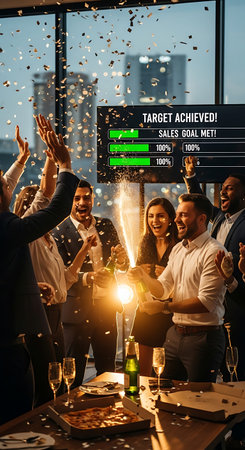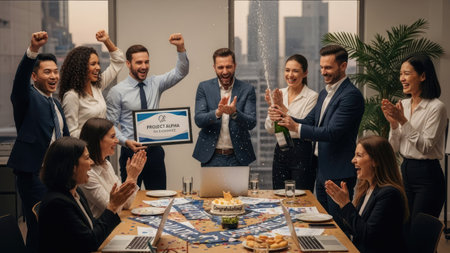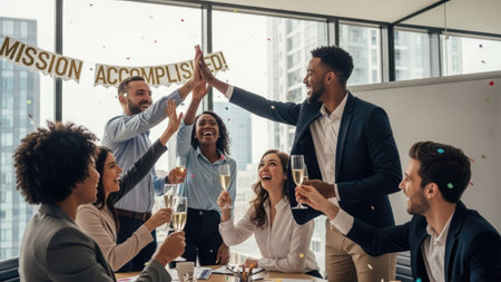 A diverse group of professionals celebrate a successful outcome in a bright office setting. They are raising champagne glasses and giving high fives, with a banner declaring 'Mission Accomplished'. The image features natural lighting and a celebratory atmosphere, suitable for illustrating business success and teamwork.