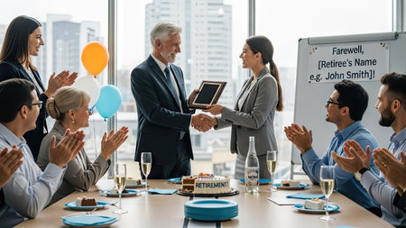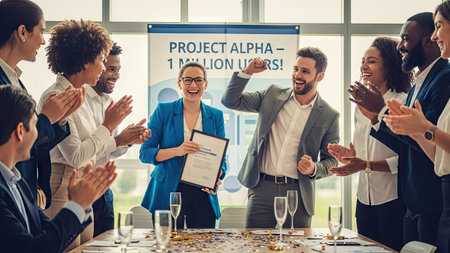A group of professionals, diverse in appearance, gather around a table. A woman in blue holds documents, celebrated with applause. The image displays a corporate setting with celebratory expressions, featuring neutral tones and warm lighting, suggesting a successful project milestone. Suitable for illustrating achievement and team collaboration.
