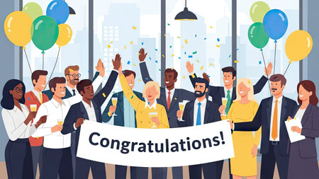 A group of people are shown celebrating an achievement, holding up a banner with the word Congratulations! The colorful illustration depicts diverse individuals in a bright office environment, raising their glasses. The composition and lighting create a celebratory atmosphere suitable for various commercial or editorial applications.