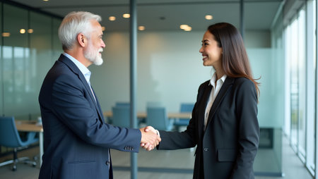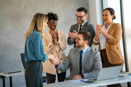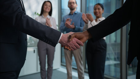 Two businesspeople shaking hands handshake agreement deal contract client director success diversity happy workers in background applaud congratulations celebrate office business company partnership