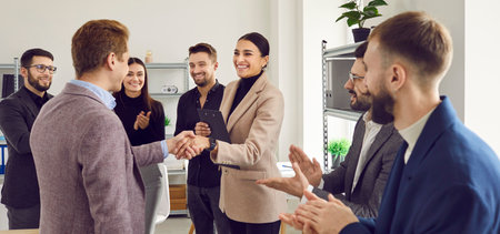 In a contemporary office, a man shakes hands with a woman while colleagues applaud their collaboration. Excitement fills the room as achievements are acknowledged in a professional setting.