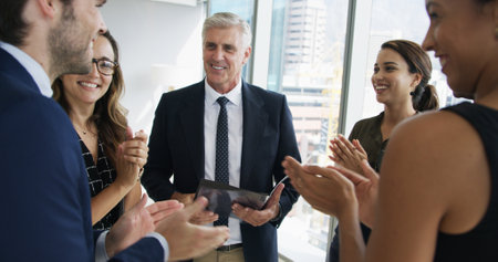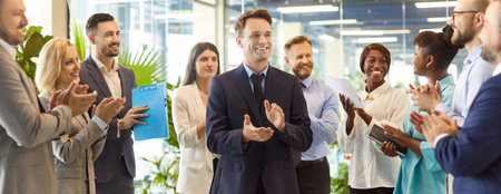 Businessman applauding surrounded by group of colleagues in an office setting. Team is celebrating a success and business achievement, showcasing teamwork in professional work environment.