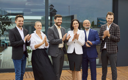 Applause of praise and recognition from confident people standing in line outside office. Acclaim and ovation from applauding happy colleagues, smiling coworkers in suits. Success, career concept