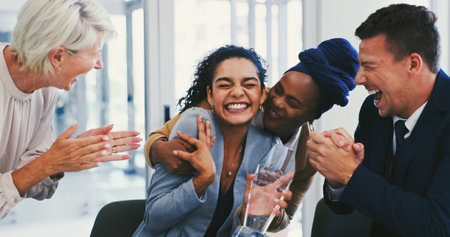 Happy group business team clapping and celebrating success or achievement in office, recognition and motivation of goal, coworker and teamwork with appreciation and applause, diversity and ethnicity.