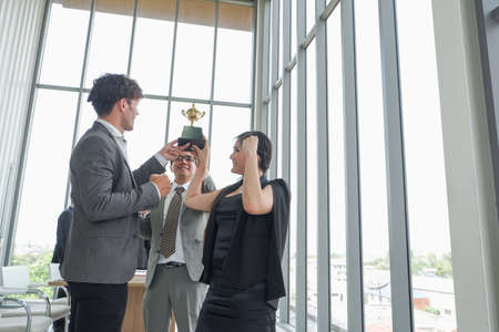 winning business team with a man executive holding a gold trophy . happy and successful business team rewarded for in the office