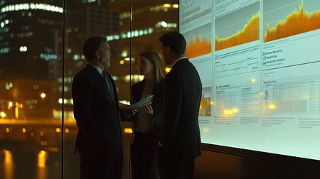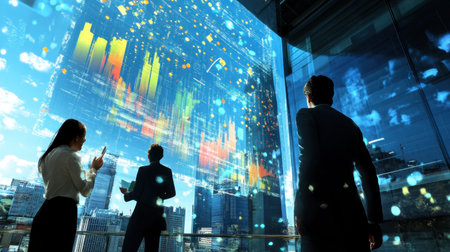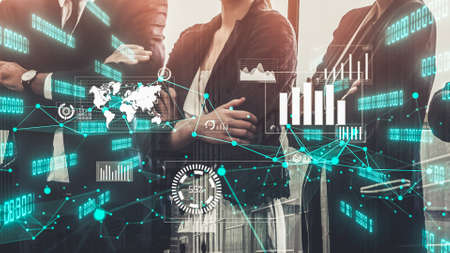 Conceptual vision of business people in corporate staff meeting . Concept of digital technology for marketing data analysis and investment decision making .