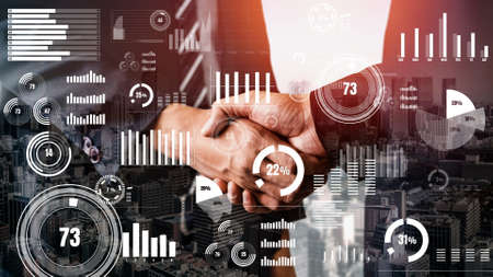 Conceptual business handshake with dashboard for financial data analysis . 3D render computer graphic .