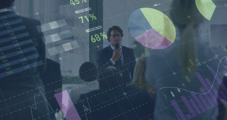 Image of financial data processing over business people in meeting. global business, connections and data processing concept digitally generated image.