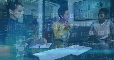 Image of stock market data processing over three diverse female colleagues discussing at office. Global economy and business technology concept