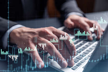 Hands typing the keyboard to research stock market to proceed right investment solutions. Internet trading and wealth management concept. Formal wear. Hologram Forex chart over close up shot.