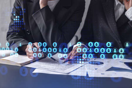 Two HR specialists analyzing the market of freshers to boost the intern program at international consulting company. Hiring new talented crew. Social media hologram icons. Women in business.