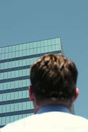 Confident businessman late for meeting running downtown street in sunny morning. Focused handsome project manager director going to important client in hurry. Serious agent rushing to office in suit.