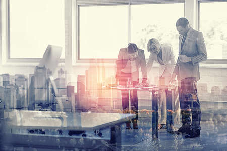 Double exposure of colleagues at business meeting and modern city. Concept of business consulting