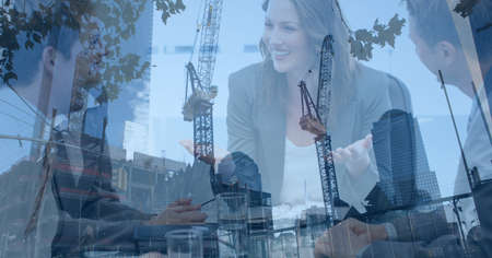 Composition of smiling male and female business colleagues over city construction site. global business, partnership and success concept digitally generated image.