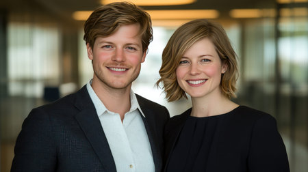 A man and woman stand side by side, displaying confidence and poise. The backdrop features a modern interior, enhancing their professional appearance.