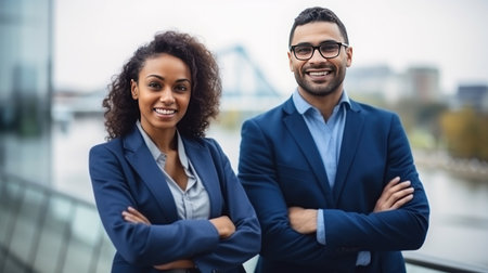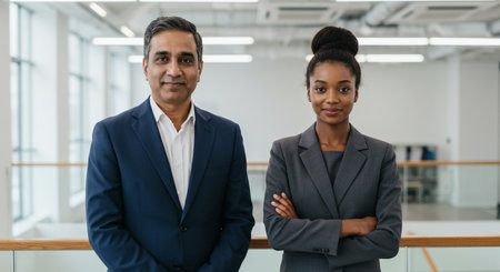 A professional male and female duo exuding confidence in a modern business environment, symbolizing diversity and effective leadership in the workplace.