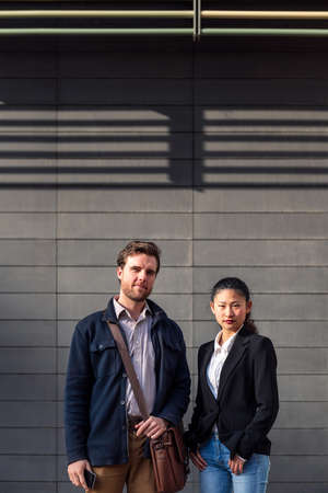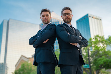 An attractive couple of businessmen in strict office suits in the city. Successful and confident office workers.