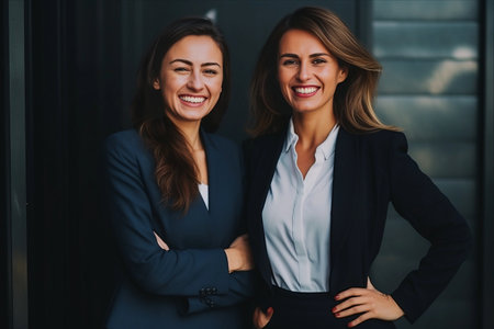 Two businesswomen in an office, one in a suit and the other in casual attire, smiling at camera