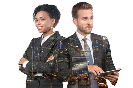 Portraits of two young business partners in suits dreaming about new career opportunities. Multinational teamwork concept. Bangkok on background. Double exposure.