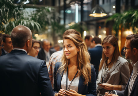 Businesswoman wearing a lanyard with a badge, smiling and engaging with others during a corporate event or conference setting