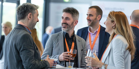 Business professionals socialize at conference exchanging ideas and networking over drinks. Concept Networking, Business Conferences, Professional Socializing, Idea Exchange, Drinks Networking