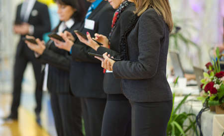 business people hands typing on smart phone during the seminar at conference room
