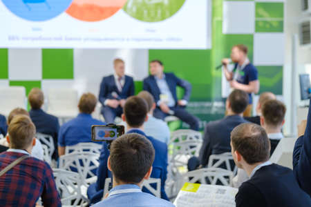 Man takes a picture of the presentation at the conference hall using smartphone.view event