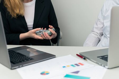 Business woman gripping The United States hundred-dollar bills in her hand and some put on the table full with business charts and notebook