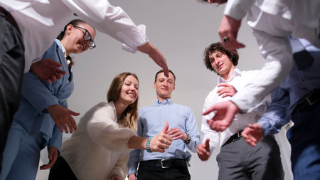 A cheerful group of young office people are standing in a circle and playing a fun office game. Leadership development, healthy competition, increased productivity and teamwork in the office