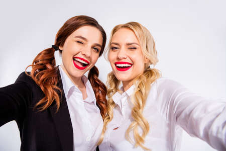Photo of two classmates ladies making selfies winking eyes wear shirts isolated white background