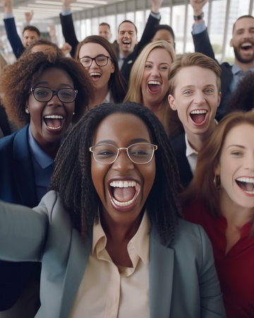 A Group of Enthusiastic Workers Huddled Together, Cheering and Celebrating the Arrival of the New Year in Their Workplace