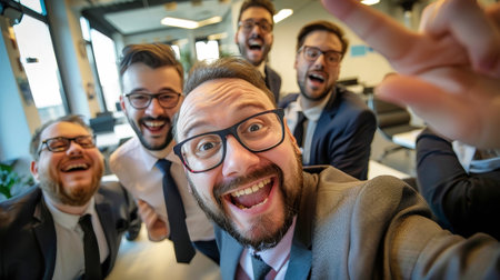 A group of funny, friendly, and happy managers in suits and ties taking a selfie together.