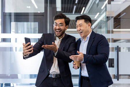 Joyful businessmen celebrating success in contemporary office. Enthusiastic expression as they look at smartphone, conveying excitement and achievement.