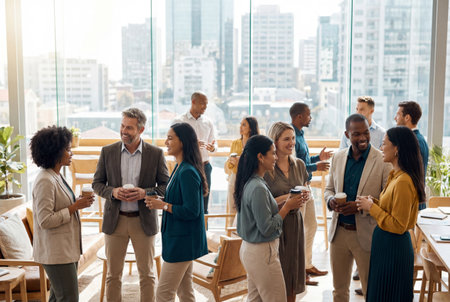 Social living. Group of businesspeople talking while having coffee, tea during break at business meeting, forum