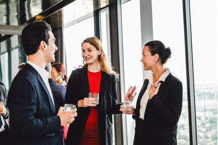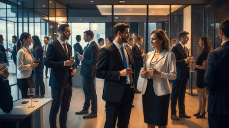 Professionals networking at a corporate event, engaged in conversation and holding drinks in a modern venue.