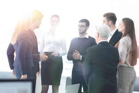 Team of business people communicating with each other. Group of happy positive young men and women standing in modern office, talking, sharing impressions after corporate meeting or training session