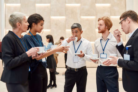 New Perspectives. Group of businesspeople talking while having coffee, tea during break at business meeting, forum