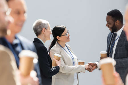 selective focus of multiethnic business people shaking hands near colleagues during coffee break
