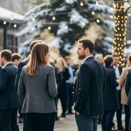 A group of formally dressed individuals gather outdoors in a winter setting, engaging in conversations and enjoying drinks, surrounded by festive lights and snow-covered trees.