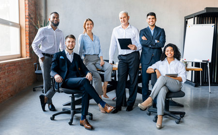 Group of business people in formal outfit working together with smile and happiness in modern workplace.