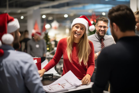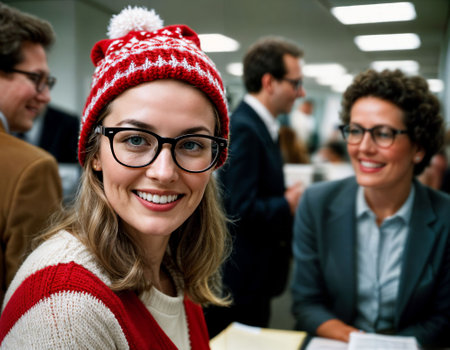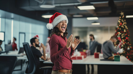 A friendly professional woman wearing a red Santa hat stands in a bright open office, conveying festive spirit and professionalism during the holidays. Generated A.I.