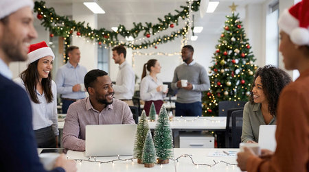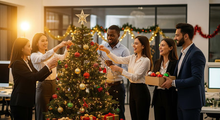 Multiethnic team of people putting christmas tree decor in festive office