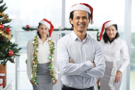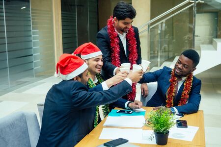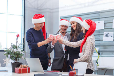 Celebrating colleagues in Santa hats on the office background. Christmas holiday concept. Copy space.