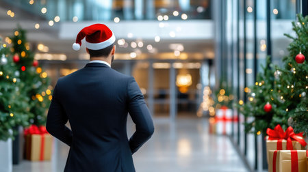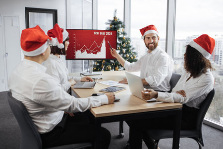 Young entrepreneur in Santa hat presents at modern office