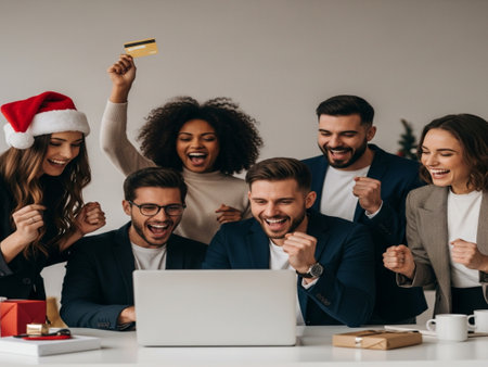 excited multicultural businesspeople in santa hats using laptop and credit card in office