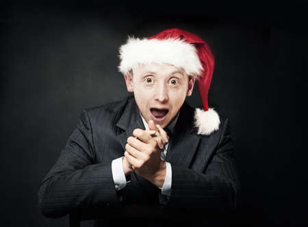 Businessman with Open Mouth. Delight and Fun. Surprised Business Man in Christmas Santa Hat on Dark Background