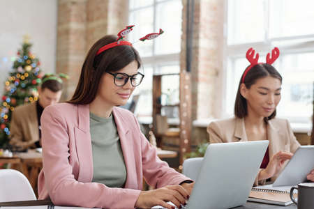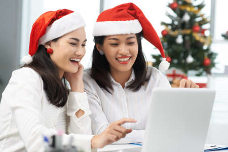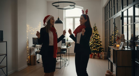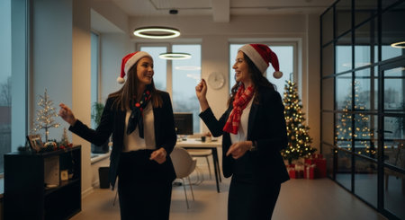 The image showcases two cheerful women in festive attire celebrating Christmas in a modern office, ideal for holiday advertising or editorial content.
