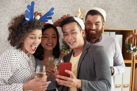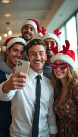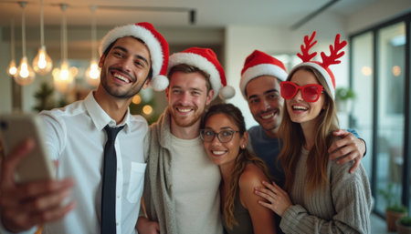 Cheerful friends taking a festive selfie in holiday attire